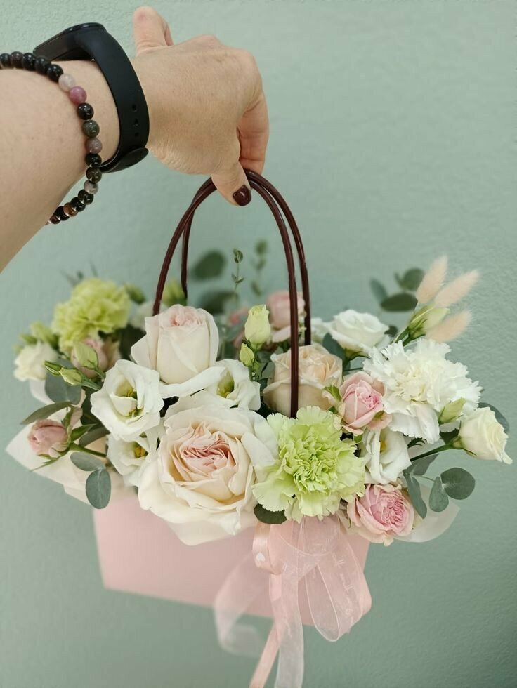 - Ручки и ленты для переноски. Особенно актуально для больших букетов и композиций. Клиенты скажут “спасибо” за то, что им не придется нести в руках букет, закрывающий все вокруг.