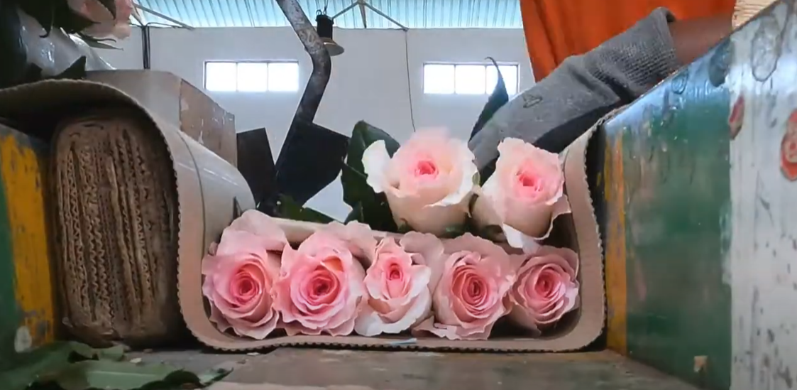 Во время охлаждения розы содержатся при температуре 3-5 градусов. После прекулинга цветы оказываются в упаковочном цехе. Там сотрудники сортируют розы по длине, очищают стебли от лишних листьев и упаковывают цветы в пачки.